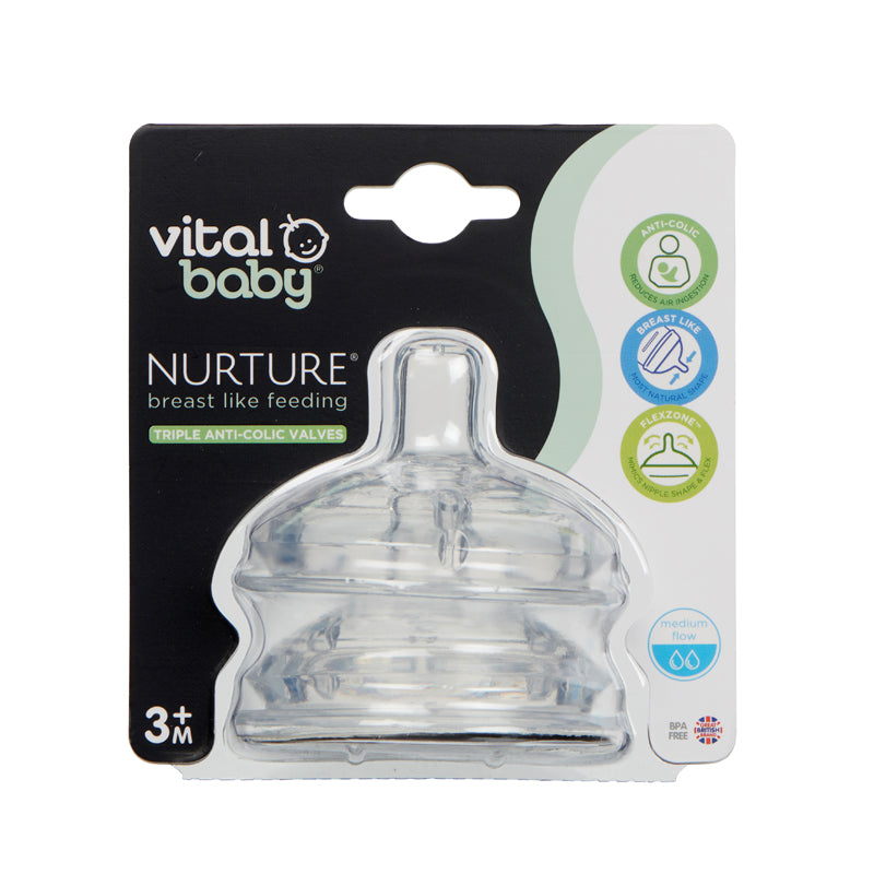 The vital baby® NURTURE breast like feeding teat has been expertly designed with advanced triple anti-colic valves to reduce air intake. The flexzone area around the bottle teat allows the teat to stretch and flex just like mum’s breast, ensuring a comfortable and natural feeding experience for baby.