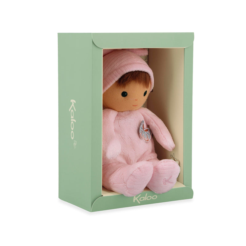 It's body is soft and cuddly, and it's little arms are an invitation to cuddle. A pretty butterfly adorns it's body, evoking the lightness and grace of flowers. The butterfly-shaped woven label is perfect for inviting little ones to touch it and develop their dexterity. It is present on all Kaloo tender babies, as a signature of the range and a symbol of connection and uniqueness.