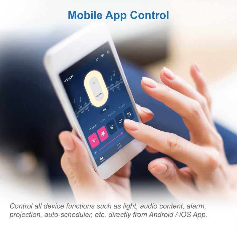 The sleek VTech Sleep Training Soother portable Bluetooth speaker includes a sleep training program, colorful one-touch night light with 250+ colours and glow-on-ceiling projector that includes preloaded stories, classical music, lullabies, and natural sounds.
