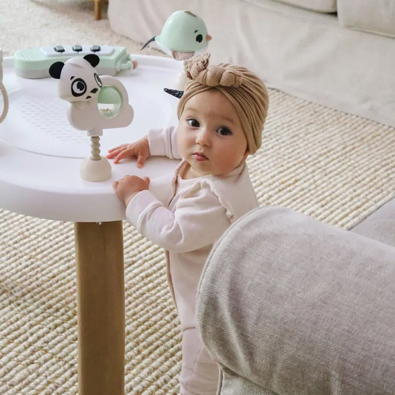 - Baby Balance Board: Once babies are sitting up independently (around six months), you can start letting them sit in the activity centre and enjoy the attached balance board to strengthen their legs and explore various sensations and textures with their feet.